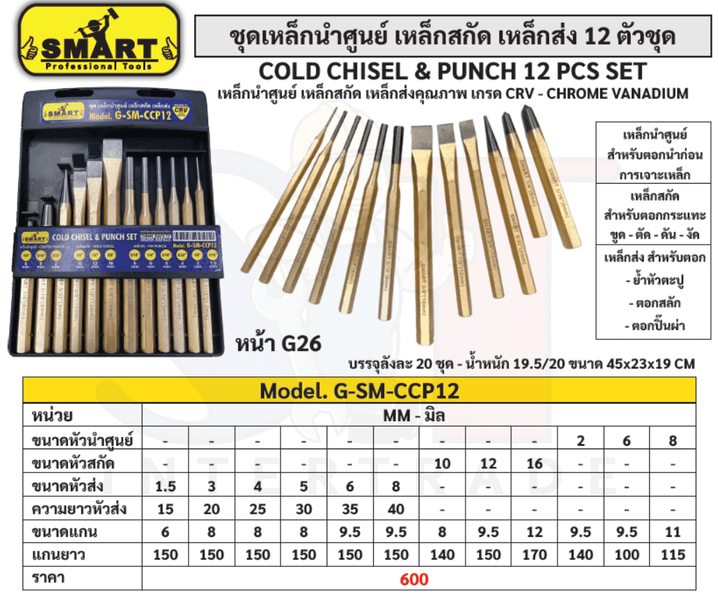 ชุดเหล็กนำศูนย์ เหล็กสกัด เหล็กส่ง 12 ตัวชุด รุ่น G-SM-CCP12