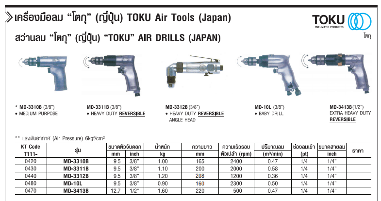 สว่านลมแบบข้องอ โตกุ (TOKU) รุ่น MD-3312B ขนาดหัวจับดอก 3/8 นิ้ว รุ่นงานหนัก สามารถหมุนได้ 2 ทิศ ขนาดแกนหมุน 3/8 นิ้ว x 24 นิ้ว (มาตรฐานนเกลียว UNF) ปริมาณลม 0.36 ลบ.ม./นาที ขนาดสายลม 1/4 นิ้ว