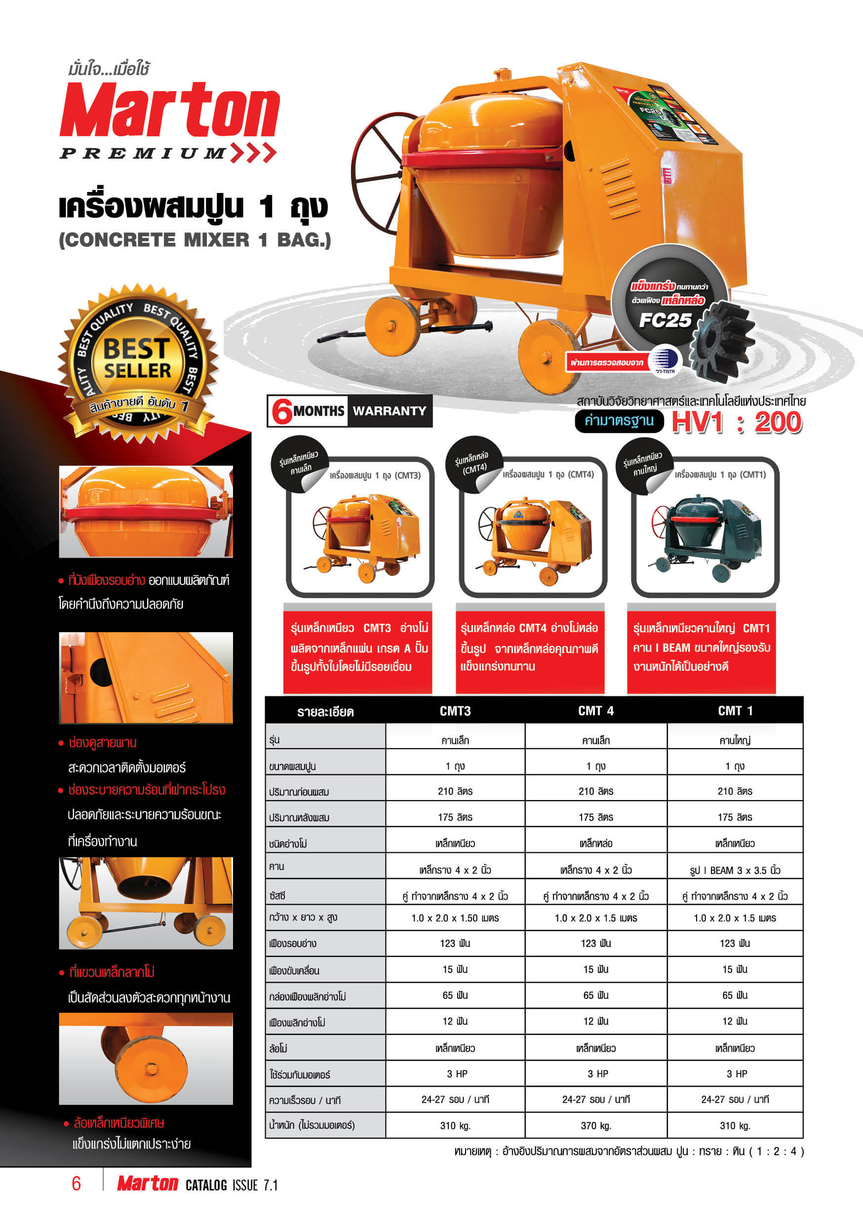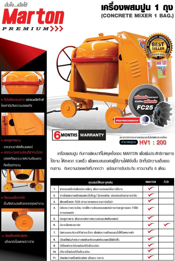 เครื่องผสมปูน 1 ถุง MARTON PREMIUM (Concrete mixer 1 Bag) กับการพัฒนาไม่เลิกราของ Marton เพื่อเพิ่มประสิทธิภาพการใช้งานให้สะดวกเพื่อตอบสนองผู้ใช้งานได้ดียิ่งขึ้นอีกทั้งมีความแข็งแรงกับความปลอดภัยที่มากกว่า พร้อมการรับประกันถึง 6 เดือน