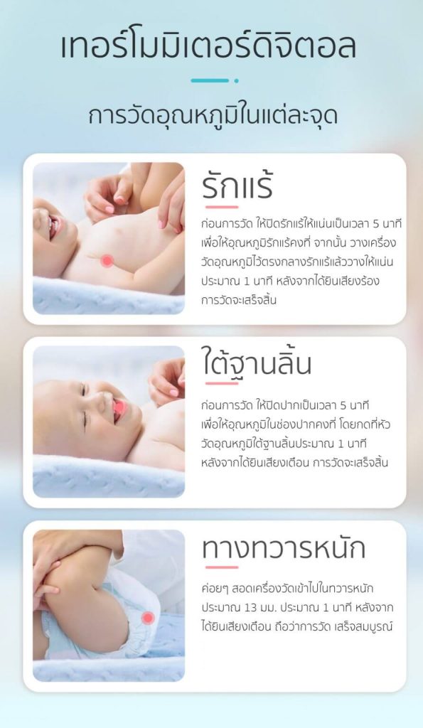 - สำหรับเด็กที่อายุ 2 ปีหรือต่ำกว่า อย่าใช้เทอร์โมมิเตอร์วัดทางช่องปาก