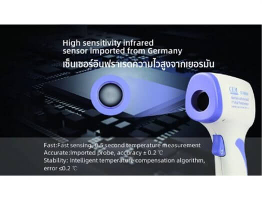 - เลือกหมวดการวัดแบบองศาเซลเซียสหรือองศาฟาเรนไฮต์ได้ และ ตรวจจับความร้อนที่หน้าผาก (Select able ๐C or ๐F & Forehead heat detection)