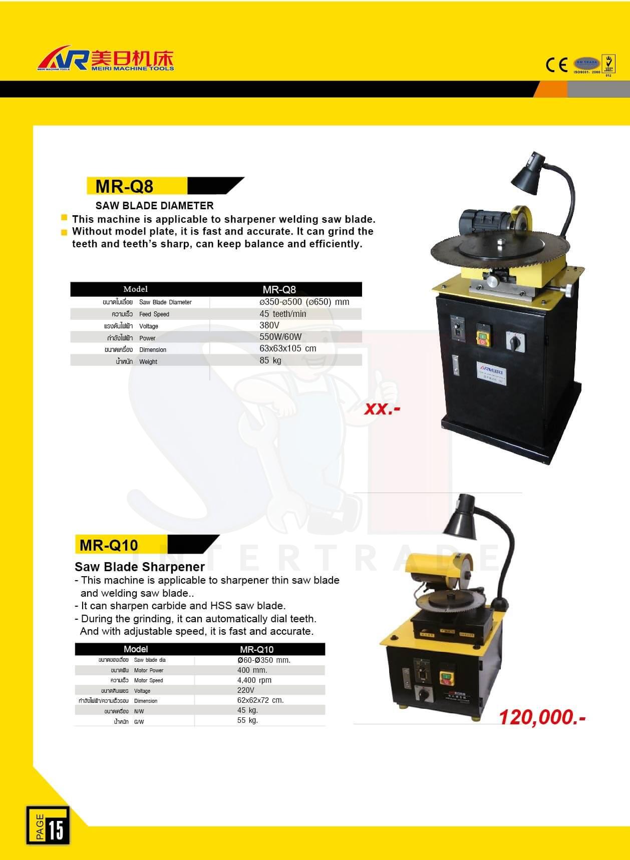 - เครื่องลับคมใบเลื่อยวงเดือน MR-Q10 เป็นเครื่องลับใบเลื่อยวงเดือนแบบอัตโนมัติ สามารถลับได้เฉพาะส่วนหน้าฟันเลื่อยเหมาะสำหรับลับเลื่อยวงเดือนฟันคาร์ไบด์ มีฟังก์ชั่นในการปรับความเร็วในการลับ และฟังก์ชั่นลับหนึ่งฟัน เว้นฟนึ่งฟัน เพื่อใช้กับฟันเลื่อยที่มีองศาสลับกัน ตัวเครื่องยังสามารถปรับมุมองศาในการลับได้ตามลักษณะฟันเลื่อย