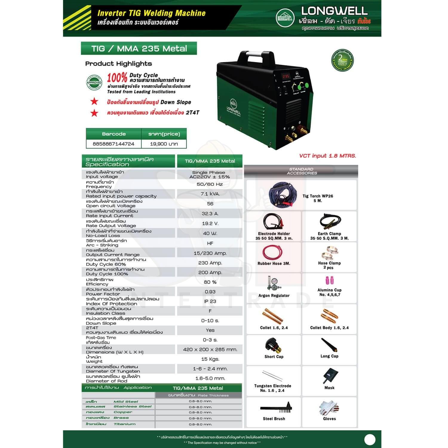 - เครื่องเชื่อม TIG/MMA 235 (Metal) 220V. ระบบอินเวอร์เตอร์ LONGWELL