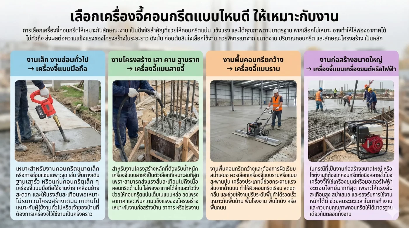 เครื่องจี้คอนกรีตแต่ละชนิดถูกออกแบบมาให้เหมาะกับลักษณะงานที่แตกต่างกัน ตั้งแต่งานเล็ก งานซ่อม ไปจนถึงงานโครงสร้างและงานก่อสร้างขนาดใหญ่ การเลือกเครื่องจี้ให้ตรงกับงานจะช่วยไล่ฟองอากาศได้อย่างมีประสิทธิภาพ ทำให้คอนกรีตแน่น แข็งแรง และได้คุณภาพตามมาตรฐาน