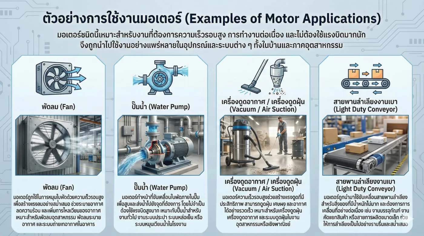 มอเตอร์ชนิดนี้เหมาะกับงานที่เน้นความเร็วในการทำงาน ความต่อเนื่อง และความเรียบง่ายของระบบ มากกว่างานที่ต้องรับน้ำหนักหรือแรงบิดสูง การเลือกใช้งานให้เหมาะสมจะช่วยให้ระบบทำงานได้อย่างมีประสิทธิภาพและคุ้มค่าในระยะยาว