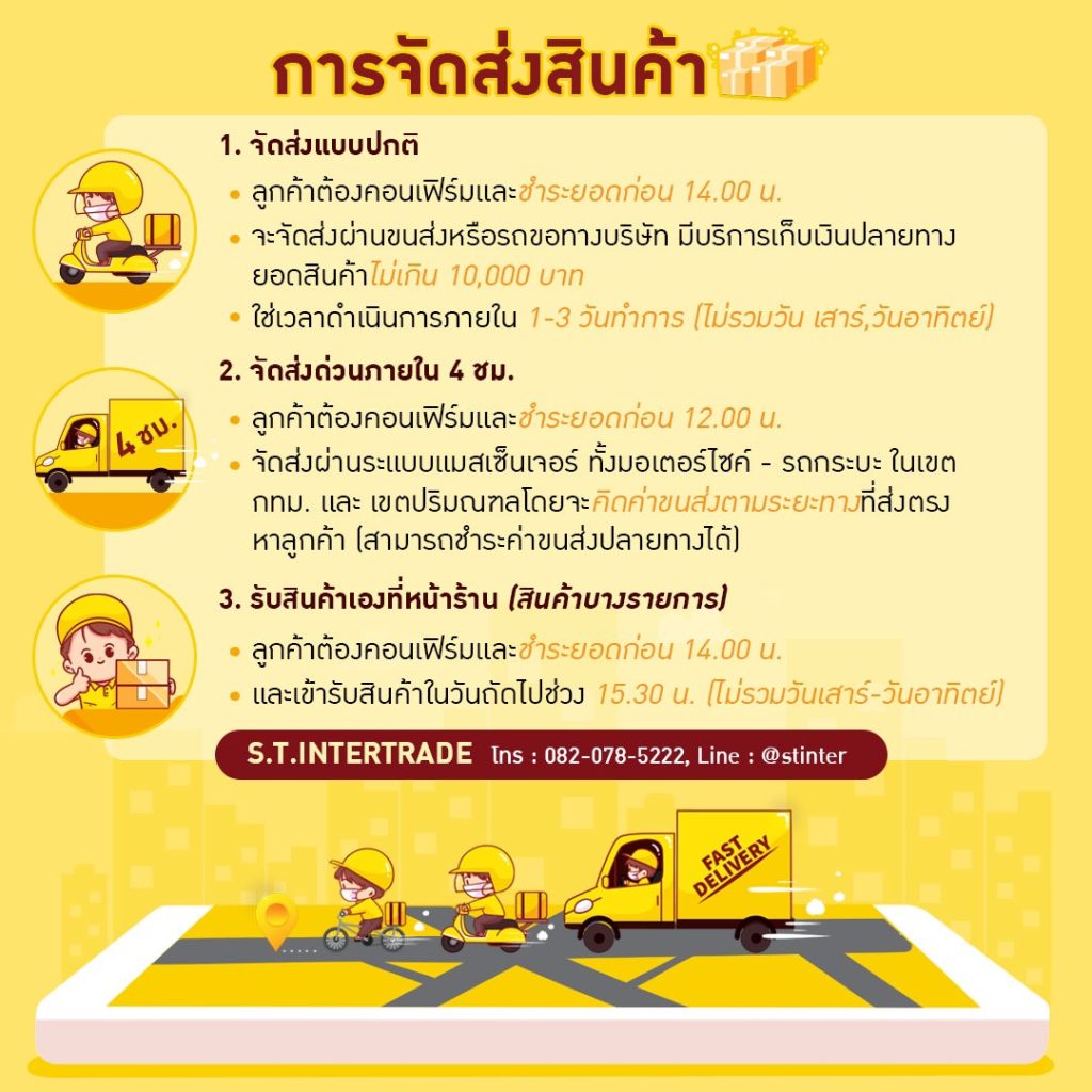 จัดส่งผ่านระแบบแมสเซ็นเจอร์ ทั้งมอเตอร์ไซค์ – รถกระบะ ในเขต กทม. และ เขตปริมณฑลโดยจะคิดค่าขนส่งตามระยะทางที่ส่งตรงหาลูกค้า (สามารถ
