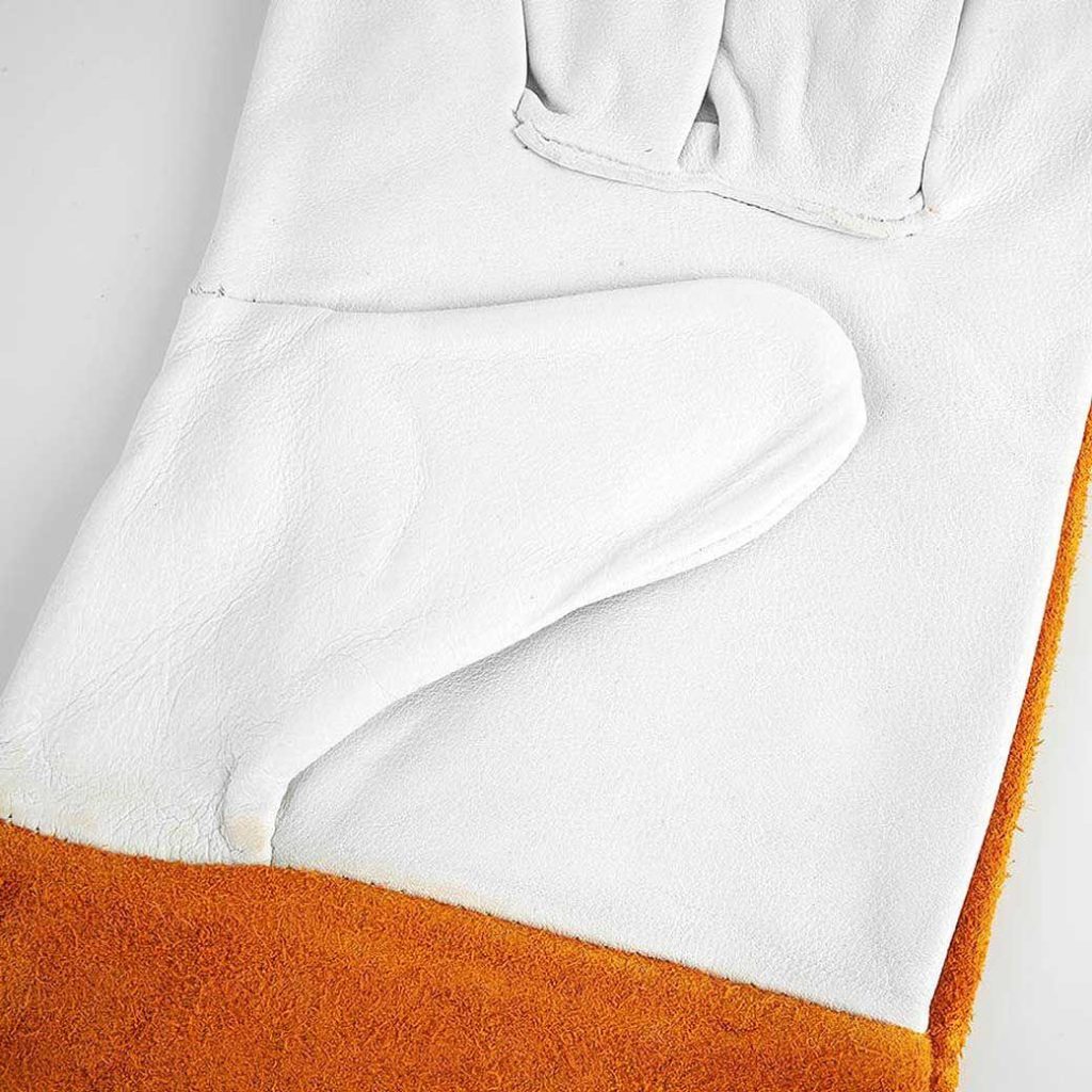 - ถุงมือหนังเชื่อมอาร์กอน ฝ่ามือจนถึงนิ้วมือทำจากหนังแพะอย่างดี