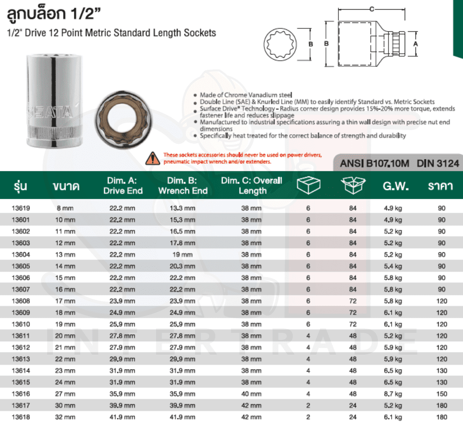 ลูกบล็อก 16 mm SATA 1/2″ DR. 12PT. 13607