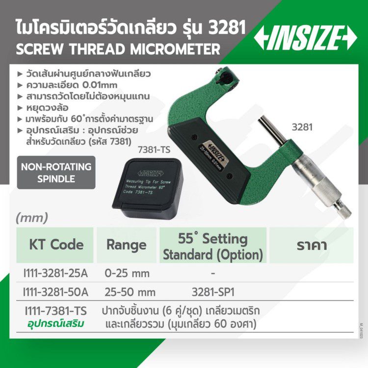 ไมโครมิเตอร์วัดเกลียว อินไซส์ (INSIZE) รุ่น 3281-25A วัดเกลียวขนาด 0-25 มม. ความละเอียด 0.01 มม. สามารถวัดโดยไม่ต้องหมุนแกน