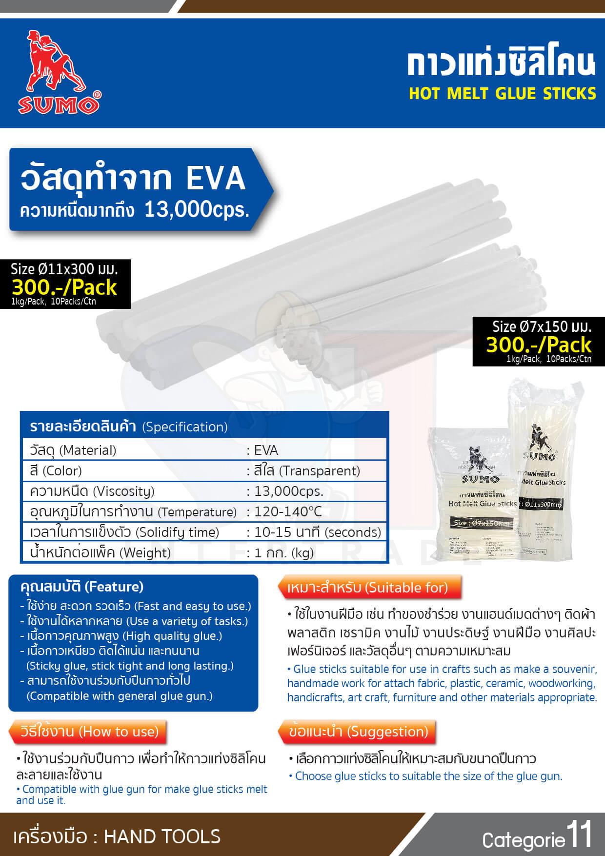 กาวแท่ง ขนาด 11x300 mm. เนื้อกาวเหนียว ติดได้แน่น ทนนาน ใช้งานร่วมกับปืนยิงกาวทั่วไป