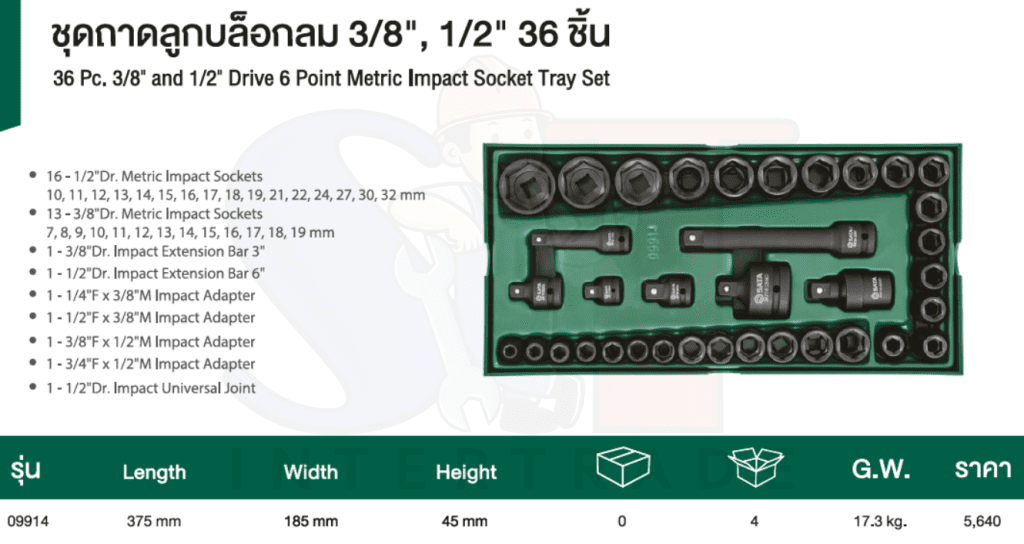 ชุดถาดลูกบล็อกลมกระแทก 3/8″, 1/2″ 36 ชิ้น SATA 09914