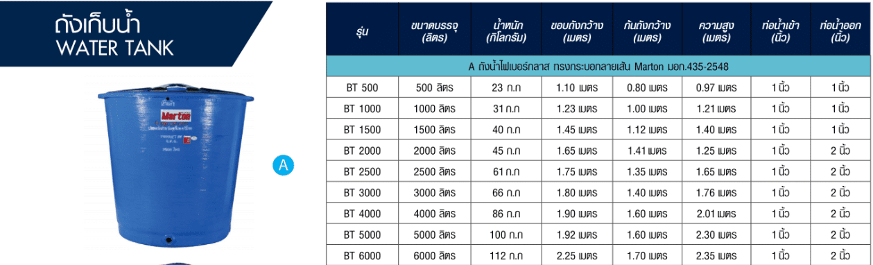 | BT 500 | 500 ลิตร | 23 กก. | 1.10 เมตร | 0.80 เมตร | 0.97 เมตร | 1 นิ้ว | 1 นิ้ว |