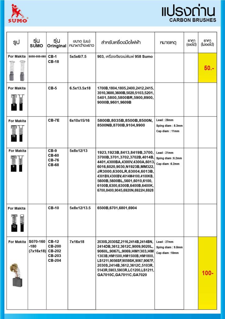 - ใช้สำหรับ เครื่อง Makita : 9027, 9027S, 9027SF, 9029, 9029SF, 9037, 9037SF, 9039, 9039SF, 9047S, 9047F, 9049, 9049SF, 9057, 9057SF, 9059, 9059SF, 9067, 9069, 9077, HM1302, HM1303, HM1303B, HM1500, HM1500B, HM1800