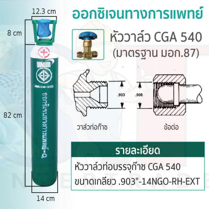 - สีท่อออกซิเจนเป็นสีเขียวมรกตส่วนคอและไหล่เป็นสีขาว ตามมาตรฐาน มอก.87