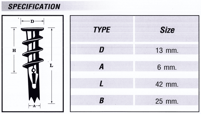 ปลั๊กยิบซั่มพร้อมสกรู 50 รุ่น GAF50 – Gypsum Anchor Fastenic ขนาดรูเจาะ(6mm.)