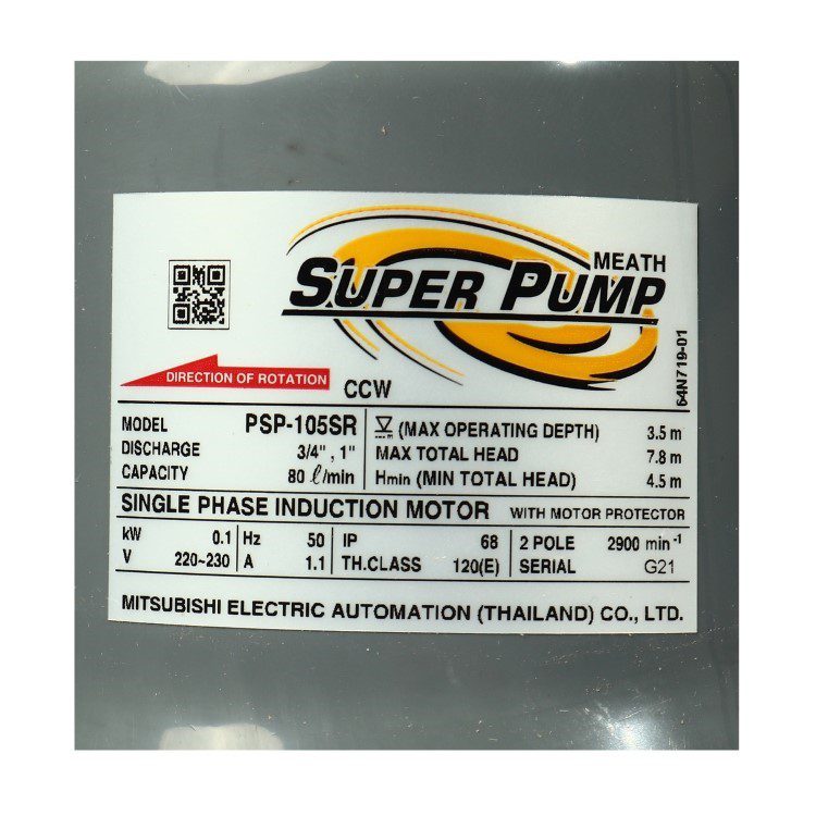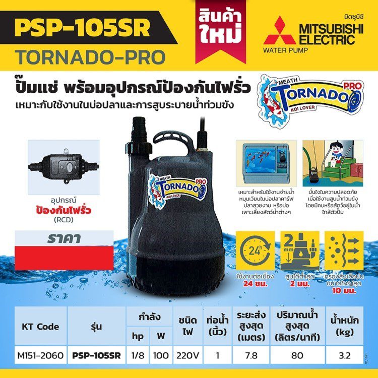 มิตซูบิชิ รุ่น PSP-105SR ปั๊มจุ่ม ขนาด 1 นิ้ว พร้อมอุปกรณ์ป้องกันไฟรั่ว ไฟ 2 สาย 220V เหมาะสำหรับบ่อเลี้ยงปลา