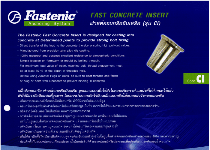ปลั๊กฝังคอนกรีต ฟาสต์คอนกรีตอินเสริต Fastenic รุ่น CI58 ขนาดเกลียว(5/8) ถูกออกแบบเพื่อใช้ฝังในคอนกรีตตรงตำแหน่งที่ได้กำหนดไว้แล้ว ทำให้มีแรงยึดติดแน่นที่สูงมาก โดยการประกอบติดไว้กับเหล็กแบบหรือไม้แบบแล้วจึงหล่อคอนกรีต |