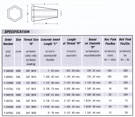 - เพื่อให้ปัญหาการติดตั้งวัตถุมีแรงยึดติดแน่นสูง จะต้องขันน๊อตตัวผู้เข้าไปในรูปลั๊กฟาสต์คอนกรีตอินเสริตอย่างน้อย 80% ของความยาวรู