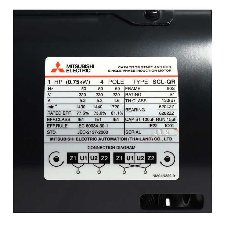 มอเตอร์ MITSUBISHI รุ่น SCL-QR กำลัง 1 แรงม้า (0.75 กิโลวัตต์) 1 เฟส 220 โวลต์ 4 โพล 2 สาย IP22 ความเร็วรอบ 1450 RPM (รอบต่อนาที)