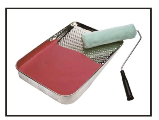 2.เทสีจากกระป๋องสีใว้ในถาดลูกกลิ้ง จุ่มลูกกลิ้งทาสีในถาดให้สีชุ่มไปทั่วขนของลูกกลิ้ง