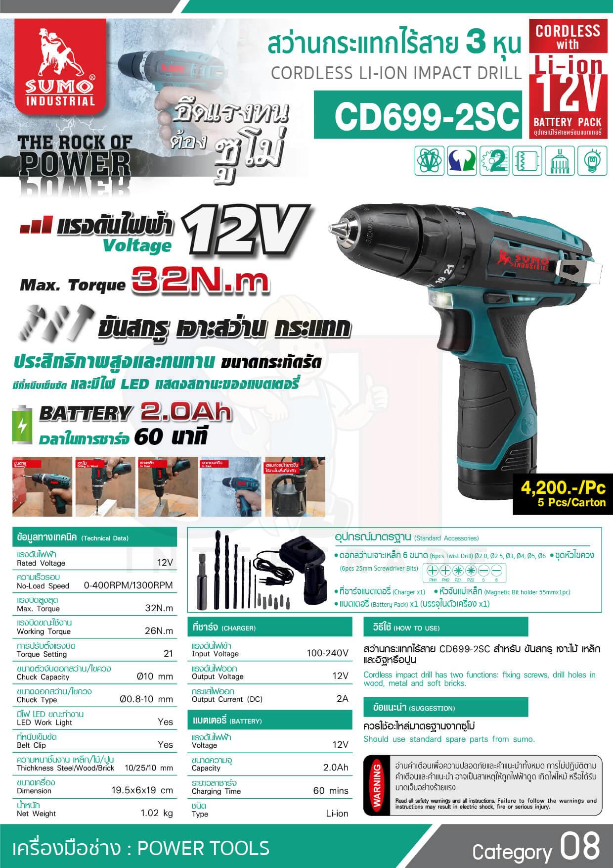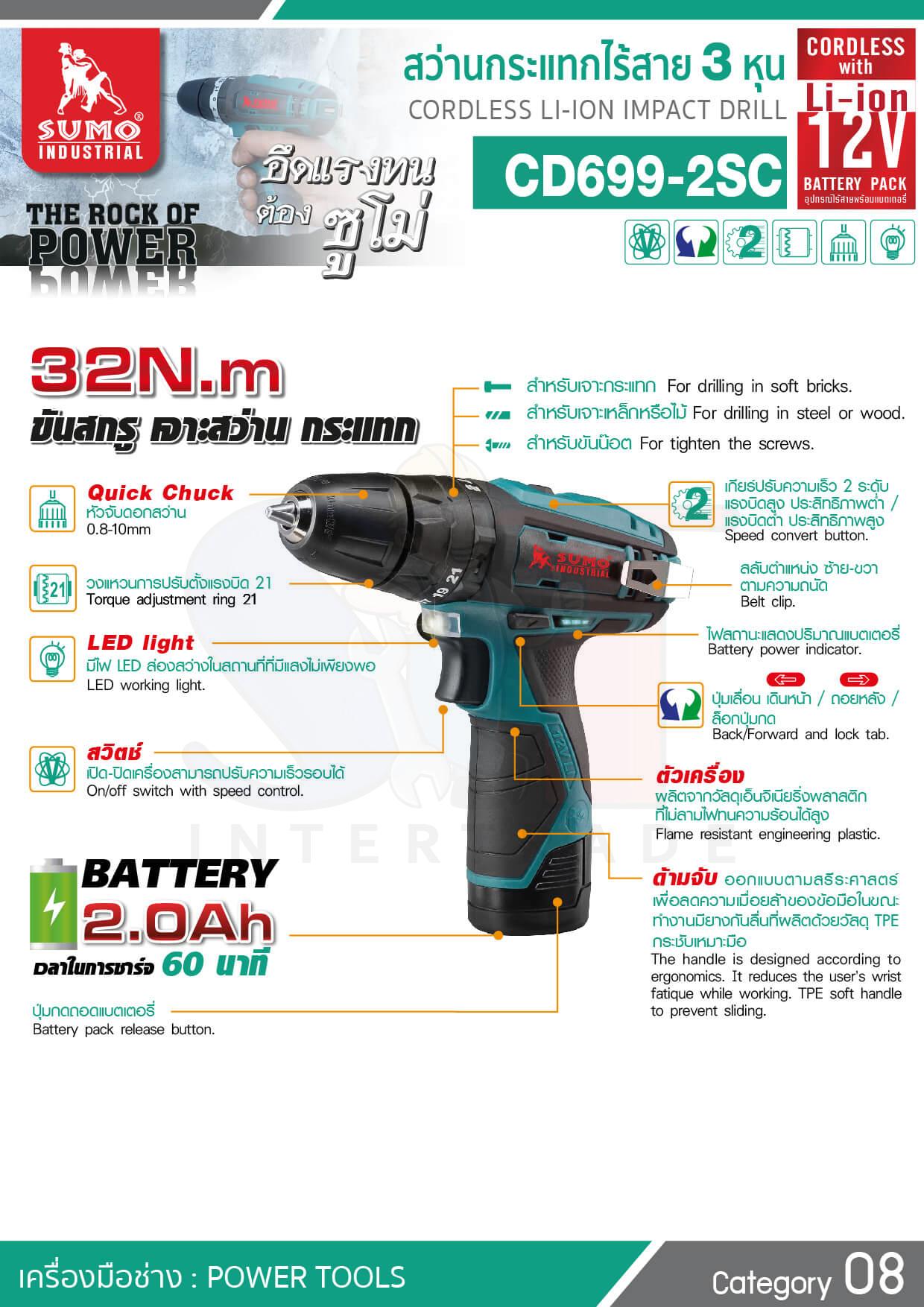 สว่านกระแทกไร้สาย 3 หุน รุ่น CD699-2SC แรงดันไฟฟ้า 12v ความจุ 2.0Ah แรงบิด 32N.m ขนาดหัวจับ 10mm