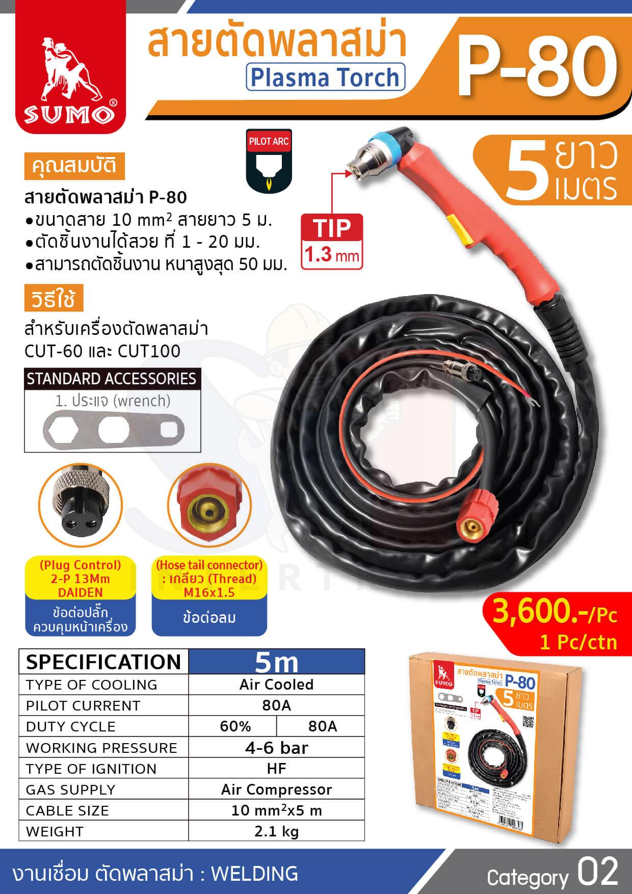 สายพลาสม่า P-80 (ยาว 5M) ใช้งานกับเครื่องตัดพลาสม่า Cut-60