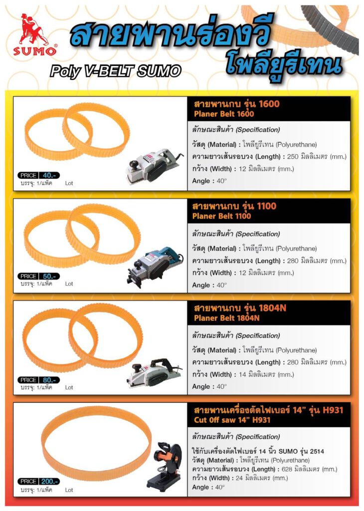คุณภาพดีที่สุดในท้องตลาด สายพานโพลียูรีเทน มีความทนทาน กว่าสายพานชนิดยาง 3-4 เท่า ความยาวเส้นรอบวง280 มิลลิเมตร กว้าง 12 มิลลิเมตร ใช้กับเครื่องกบรุ่น 1100 และ เครื่องกบไฟฟ้า 3-1/4" รุ่น 111 SUMO
