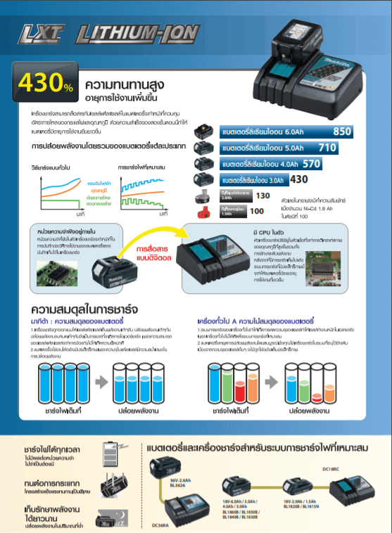 – ใช้เวลาในการชาร์จแบตเตอรี่ LI-ION 3.0AH เพียง 22 นาที และแบตเตอรี่รุ่น LI-ION 1.3 – 1.5 AH ใช้เวลาในการชาร์จเพียง 15 นาที