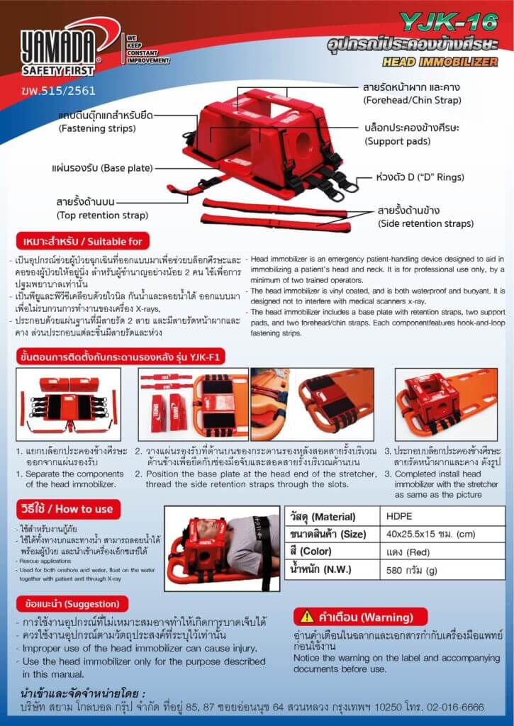 • เป็นอุปกรณ์ช่วยผู้ป่วยฉุกเฉินที่ออกแบบมาเพื่อช่วยบล็อคศรีษะและคอของผู้ป่วยให้อยู่นิ่ง สำหรับผู้ชำนาญอย่างน้อย 2 คน ใช้เพื่อการปฐมพยาบาลเท่านั้น