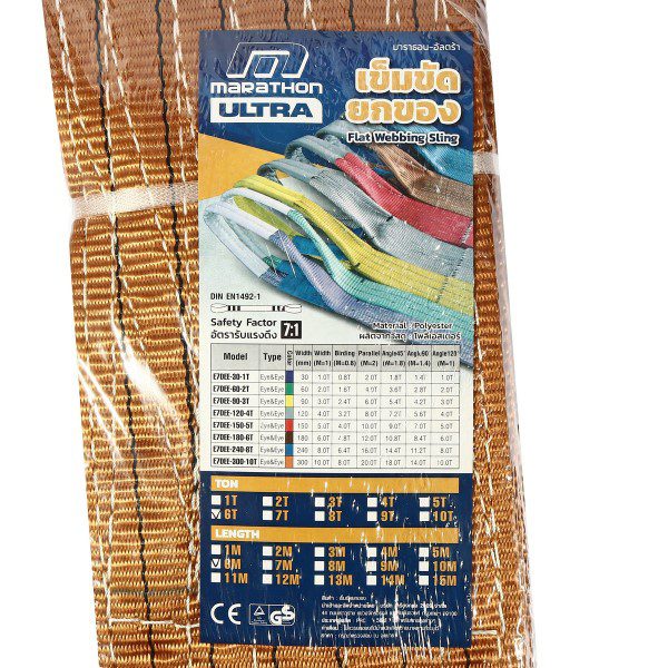 MARATHON เข็มขัดยกของ 6 ตัน ยาว 6 ม. กว้าง 180 มม. รุ่น ULTRA อัตรารับแรงดึง (7:1) 42 ตัน สีน้ำตาล ผลิตจากเส้นใยโพลีเอสเตอร์ (มาราธอน)