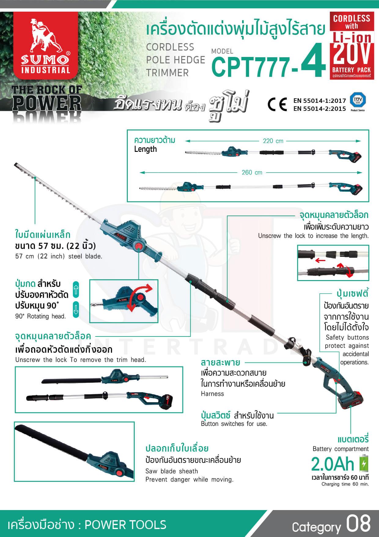 - เครื่องตัดแต่งพุ่มไม้สูง รุ่น CPT777-4 SUMO ใช้งานสะดวกทนทาน และที่สำคัญพกพาสะดวกเพราะสามารถถอดเก็บอุปกรณ์ได้ วัสดุคุณภาพดี คุ้มค่าคุ้มราคา