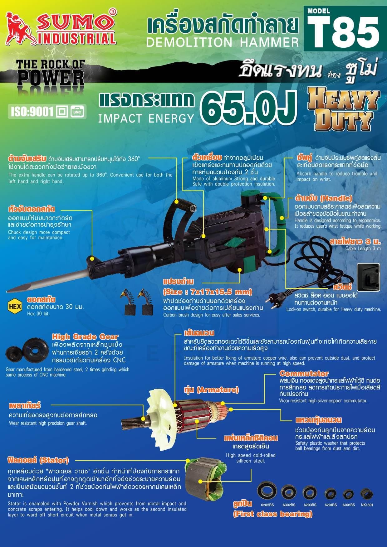เครื่องสกัดทำลาย 65 จูล รุ่น T85 SUMOแรงกระแทก 65J มอเตอร์ 1800W อัตราการกระแทก 1900 ครั้ง/นาที ทำลายได้อย่างมีประสิทธิภาพ