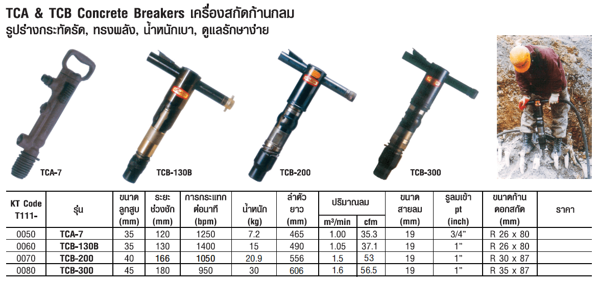 เครื่องสกัดลม โตกุ (TOKU) รุ่น TCB-300 มาพร้อมดอกสกัดแหลมยาว 18 นิ้ว สำหรับงานหนักปานกลาง มีช่วงชักลูกสูบยาว เพิ่มแรงกระแทกให้สูงขึ้นขนาดลูกสูบ 45 มม. ความยาวช่วงชัก 180 มม. ปริมาณลม 1.6 ลูกบาศก์เมตร/นาที (56.5 ลูกบาศก์ฟุต/นาที)