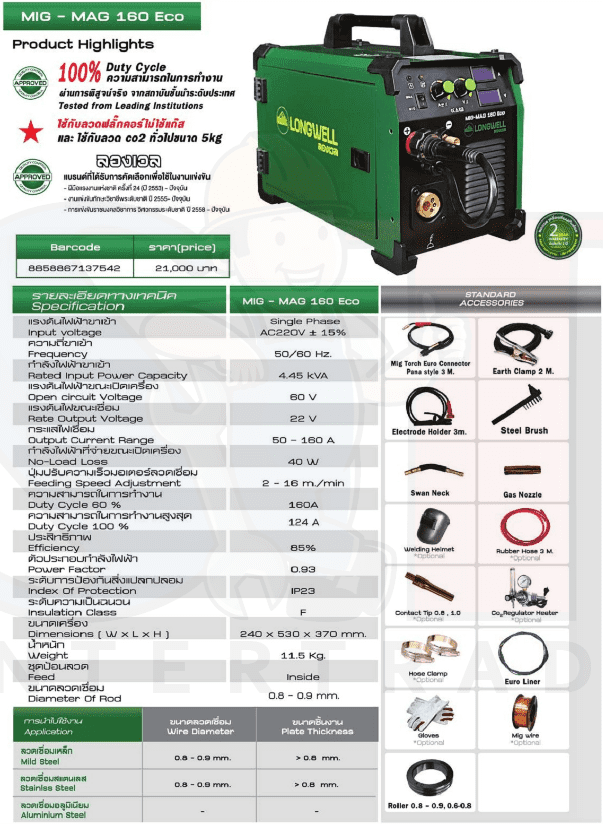 - เครื่องเชื่อม MIG-MAG 160 220V. ระบบอินเวอร์เตอร์ LONGWELL