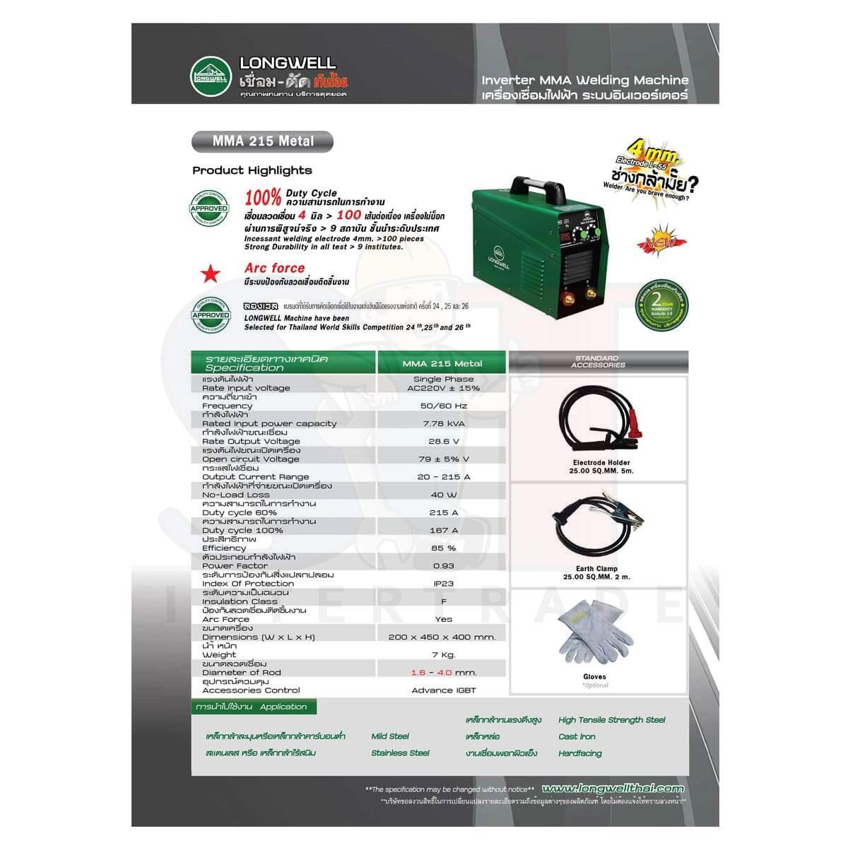 เครื่องเชื่อมไฟฟ้า LONGWELL MMA 215 Metal ระบบอินเวอร์เตอร์