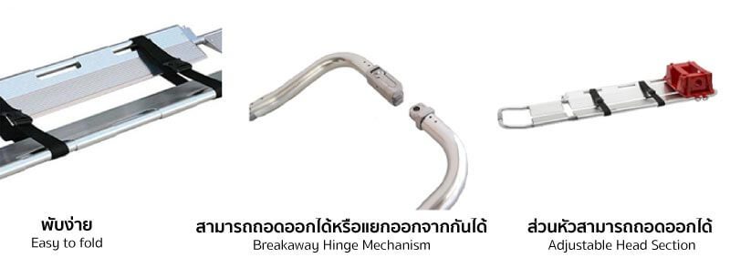 - สามารถแยกส่วนเปลได้เป็น 2 ส่วน โดยการใช้สอดเปลซีกซ้าย/ซีกขวาเข้ารับต้วผู้ป่วยและล็อคยึดขาเปลเข้าด้วยกันโดยไม่ต้องเคลื่อนย้ายผู้ป่วย