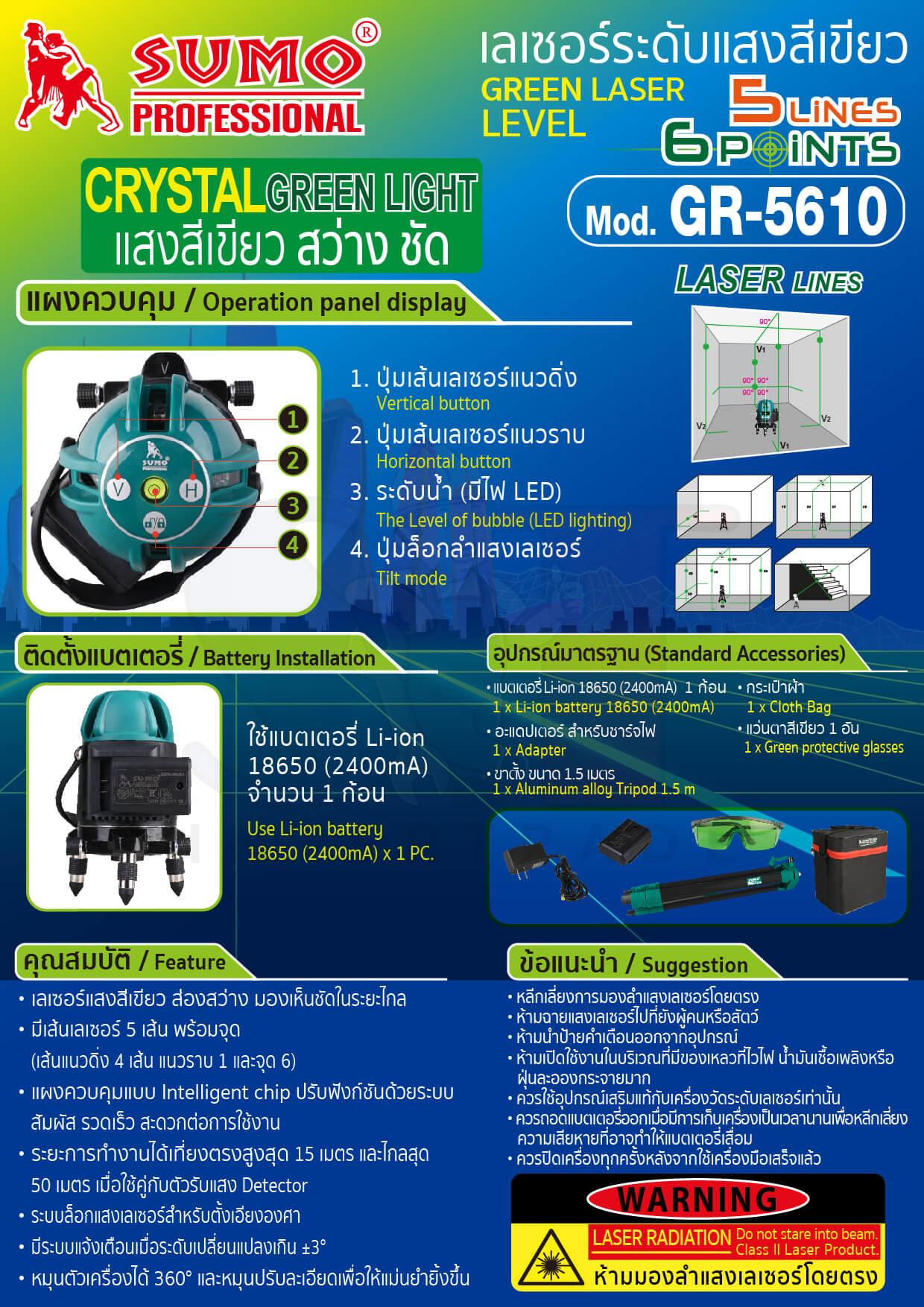 เลเซอร์ระดับแสงสีเขียว 5 เส้น 6 จุด รุ่น GR-5610 SUMO