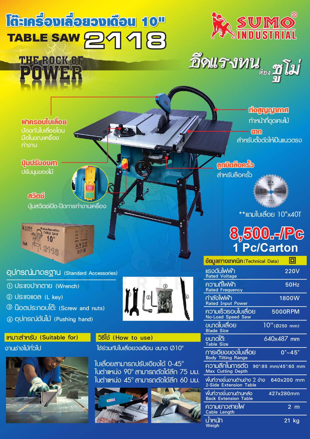 โต๊ะเลื่อยวงเดือน 10 นิ้ว รุ่น 2118 กำลังไฟ 1800W ความเร็วรอบใบเลื่อย 5000RPM