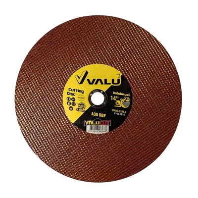 ใบตัดไฟเบอร์ 2 ชั้น วาลู (VALU) ขนาด 14 นิ้ว หนา 3 มม. ความเร็วรอบ 4,300 รอบต่อนาที รูกลาง 25.4 มม. มีเส้นใย 2 ชั้นช่วยให้ใบตัดมีความแข็งแรงไม่แตกหักง่าย เหมาะสำหรับงานตัดเหล็ก สแตนเลส
