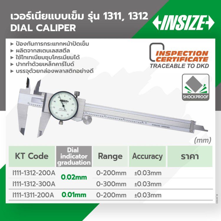 เวอร์เนียร์ไดอัลแบบเข็ม (Dial Caliper) อินไซส์ (INSIZE) รุ่น 1312-200A ช่วงระยะวัด 0-200 มม.(0-8 นิ้ว) G0.02 ความละเอียด 0.02 มม. ความแม่นยำ +-0.03 มม. ทำจากสแตนเลสสตีล