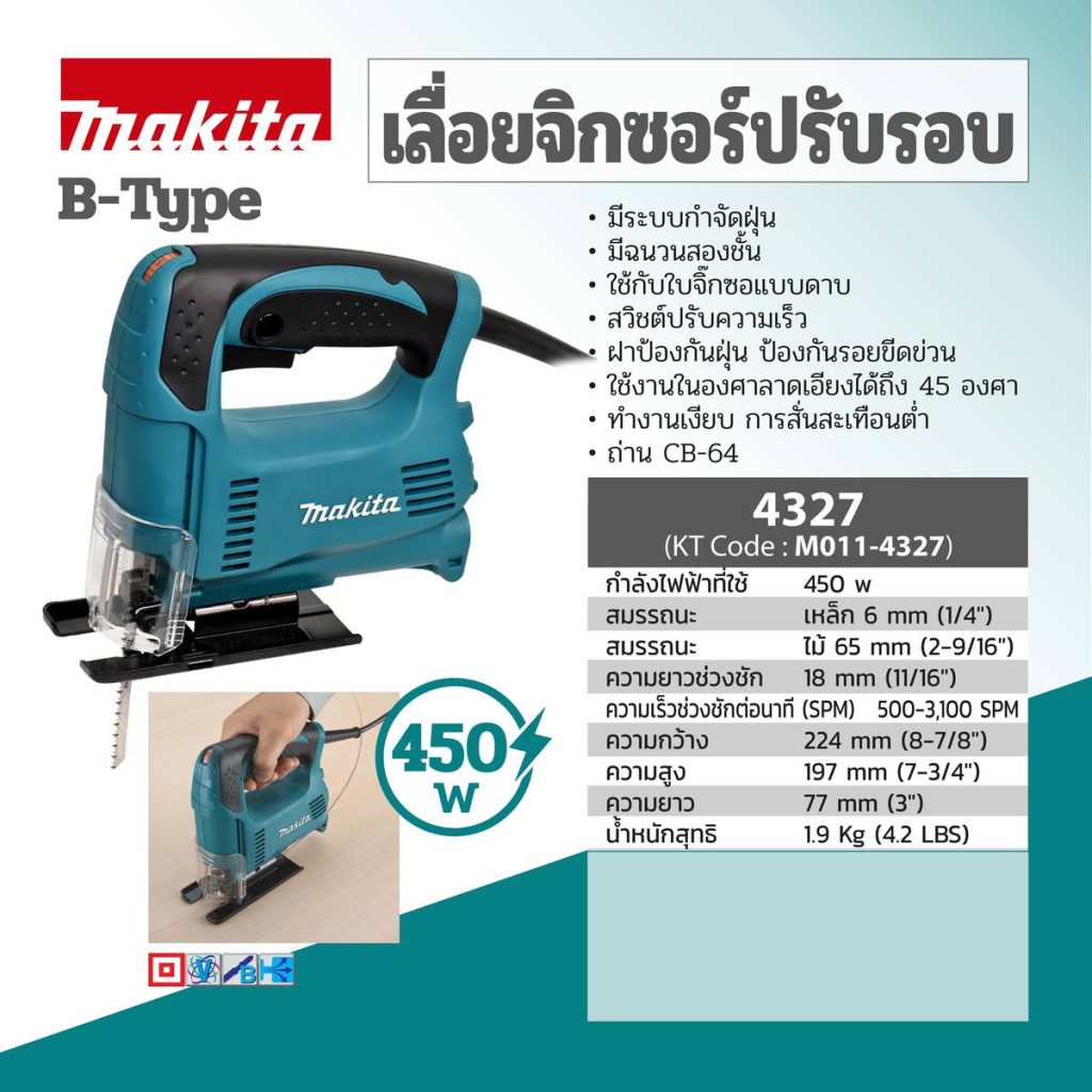 MAKITA เลื่อยจิ๊กซอว์ปรับรอบ B-TYPE กำลังไฟ 450 วัตต์ รุ่น 4327 ความยาวช่วงชัก 18 มม. (11/16 นิ้ว) ความเร็วช่วงชัก 500 – 3,100 จังหวะ/นาที มีระบบกำจัดฝุ่น ฉนวน 2 ชั้น (มากีต้า)