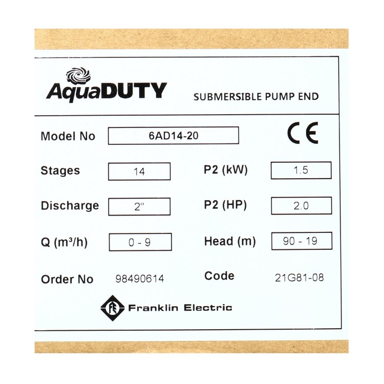 FRANKLIN เฉพาะหัวปั๊มบ่อบาดาล ขนาด 4 นิ้ว รุ่น 6AD14-20 กำลังมอเตอร์ 2 แรงม้า ท่อส่ง 2 นิ้ว ส่งสูง 63-19 เมตร ปริมาณน้ำ 90-150 ลิตร/นาที 14 ใบพัด ไม่รวมมอเตอร์ (แฟรงคลิน)