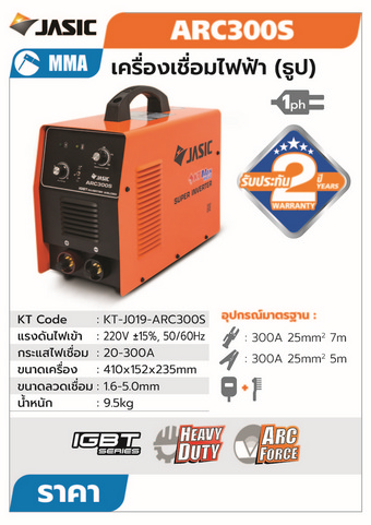 เครื่องเชื่อม JASIC รุ่น ARC-300S เป็นเครื่องเชื่อมระบบอินเวอร์เตอร์แบบอาร์ค ใช้ไฟฟ้า 1 เฟส (220 โวลต์) กระแสเชื่อม 300 แอมป์ มีระบบป้องกันไฟกระชาก OVER-VOLTAGE และ OVER-CURRENT ประหยัดกระแสไฟฟ้า สามารถเชื่อมเหล็ก สแตนเลส และอลูมีเนียม ใช้ลวดเชื่อมทั่วไปได้เกือบทุกชนิดเป็นรุ่นยอดนิยมเนื่องจากใช้งานได้หลากหลาย