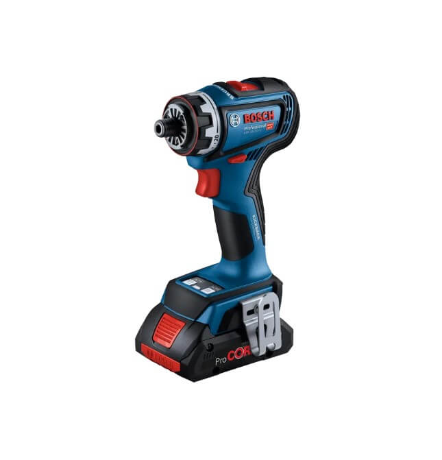 GSR 18V-90 FC Professional ที่ทรงพลังเป็นส่วนหนึ่งของ FlexiClick System จาก Bosch Professional ซึ่งพร้อมรับมือกับทุกความท้าทายในไซต์งาน: อแดปเตอร์ออฟเซ็ตช่วยให้ทำงานชิดกับขอบหรือผนังได้ ในขณะที่อแดปเตอร์มุมฉากจะเปลี่ยนสว่านไขควงให้เป็นสว่านมุมฉาก อุปกรณ์เสริมเหล่านี้สามารถเปลี่ยนตำแหน่งล็อคยึดได้ 16 ตำแหน่งเป็นมุม 360° โดยไม่ต้องถอดออกจากเครื่องมือ เมื่อต่ออแดปเตอร์สว่านโรตารี่รุ่น GFA 18-H เครื่องมือของคุณก็จะกลายเป็นสว่านโรตารี่ระบบ SDS plus แบบเต็มตัว พร้อมทำงานเจาะกระแทกรูขนาด Ø 10 มม. ในคอนกรีตได้ง่ายและไม่เปลืองแรง ด้วยความยาวส่วนหัวเพียง 136 มม. และแรงบิดสำหรับงานหนักสูงสุดถึง 64 Nm จึงเป็นเครื่องมือขนาดกะทัดรัดที่ทรงพลัง FlexiClick System จาก Bosch Professional อัดแน่นด้วยประสิทธิภาพสำหรับช่างมืออาชีพ