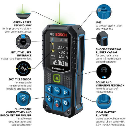 - มีเซ็นเซอร์วัดความลาดเอียง 360° แบบในตัว ช่วยให้วัดมุม/ความเอียงได้อย่างง่ายดาย เพิ่มความคล่องตัวให้กับการวัดระยะด้วยเลเซอร์ยิ่งกว่าเดิม