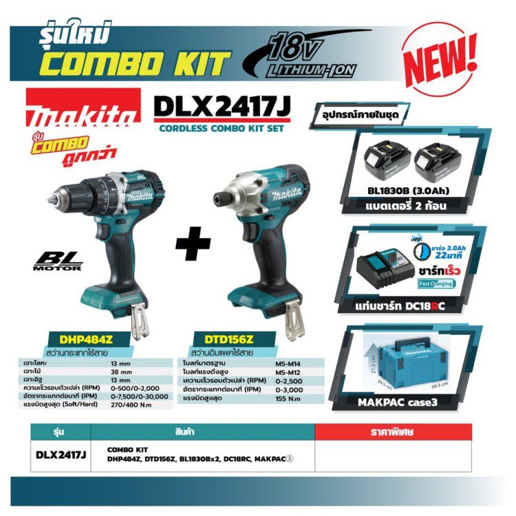 ชุด Combo Kit 18V มากีต้า (MAKITA) รุ่น DLX2417J ในชุดประกอบด้วย สว่านกระแทกไร้สาย 2 ระบบ รุ่น DHP484Z สว่านอิมแพคไร้สาย รุ่น DTD156Z แบตเตอรี่ 18V BL1830B LI-ION 3.0Ah 2 ก้อน แท่นชาร์จแบตเตอรี่ DC18RC 18V รุ่นชาร์จเร็ว 1 ชิ้น พร้อมกล่องเครื่องมือ 1 ชิ้น