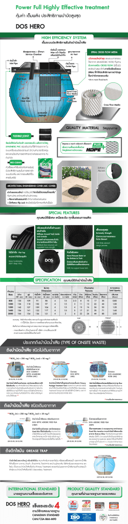 ถังบำบัดน้ำเสีย DOS HERO HIGH EFFICIENCY SYSTEM เต็มประสิทธิภาพในถังบำบัดน้ำเสีย กับนวัตกรรมใหม่ล่าสุด Spiral Cross Flow Media ของระบบการกรองไร้อากาศ (Anaerobic Filter) ที่ผสานตัวกลางชนิด Cross Flow(มีพื้นผิวและช่องว่างสูง) เข้ากับการจัดเรียงตัวแบบ Spiral ที่ทำให้ประสิทธิภาพการบำบัดสูงขึ้นกว่าตัวกรองแบบเดิม