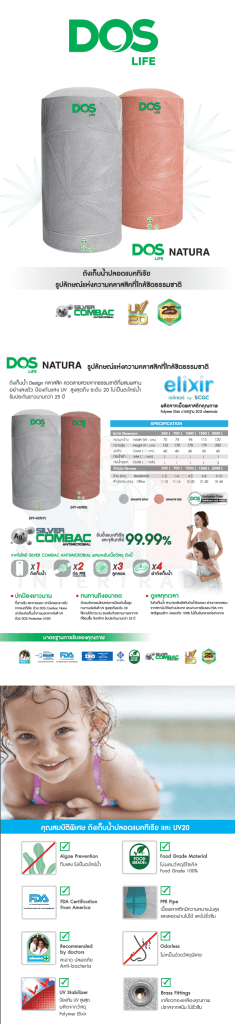 ถังเก็บน้ำ DOS Natura สะอาด ปลอดภัย ด้วยเทคโนโลยี DOS Ag+ Silver Combac Anti-Microbial ได้รับการพัฒนาร่วมกับคณะวิทยาศาสตร์ จุฬาลงกรณ์มหาวิทยาลัย และได้รับมาตรฐานการรับรอง NanoQ จากสมาคมนาโนเทคโนโลยีแห่งประเทศไทย เป็นรายแรกและรายเดียว นวัตกรรมใหม่แห่งการป้องกันขั้นสูง DOS Protection UV24 ทนทานต่อรังสี UV สูงสุด ใช้งานได้ยาวนาน รองรับสภาพอากาศร้อนชื้น รับประกัน LIFETIME WARRANTY