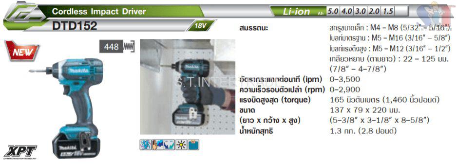 รุ่น DTD152 คือไขควงกระแทกไร้สายที่ใช้พลังงานจากแบตเตอรี่ลิเธียมไอออน 18V และได้รับการพัฒนาเพื่อการใช้งานหลักๆ เช่น การขันสกรูปลายสว่านหรือสกรูเกลียวสำหรับงานเบา