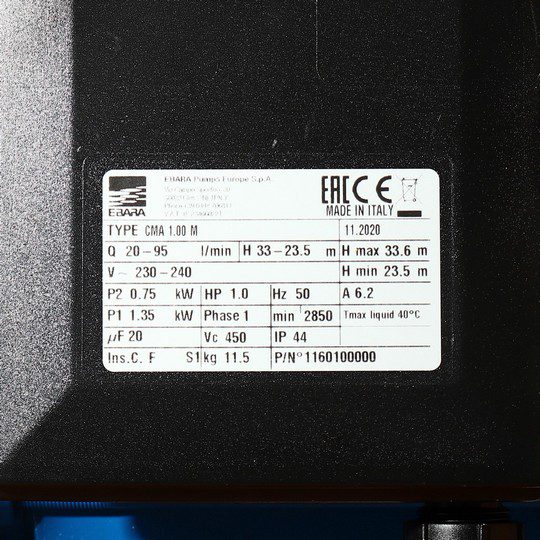 ปั๊มหอยโข่ง 1 แรงม้า EBARA รุ่น CMA-1.00M เป็นปั๊มน้ำหอยโข่งรุ่นยอดนิยม เนื่องจากความทนทาน อัตราการสูบน้ำ 95 ลิตร/นาที ขนาดท่อส่งและท่อดูด 1 นิ้ว มีจุดใช้งานที่ค่อนข้างกว้าง เหมาะกับการใช้งานหลากหลายประเภท ปั๊มรุ่นนี้เป็นปั๊มน้ำหอยโข่งแบบใบพัดเดี่ยว ตัวเครื่องจะมีความแข็งแรงและทนทานเป็นพิเศษเนื่องจากตัวเรือนปั๊มผลิตจากเหล็กหล่อขึ้นรูป ใบพัดผลิตจากทองเหลืองไม่เป็นสนิม และเพลาผลิตจากสแตนเลสเกรด AISI303 ใช้สูบน้ำที่สะอาด และน้ำบาดาลที่ไม่มีตะกอน